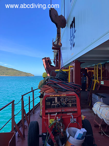 Underwater Welding (Broco systems), installation of a cofferdam against the hull of a Container ship (depth 8 m)